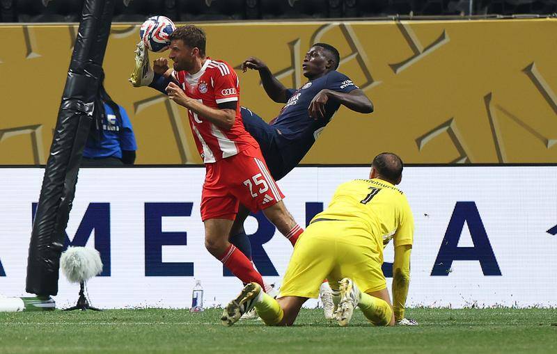 7月5日,穆勒(左)与巴黎圣日耳曼队的努诺·门德斯(中)在比赛中拼抢,用头抢先触球。新华社记者 李明 摄